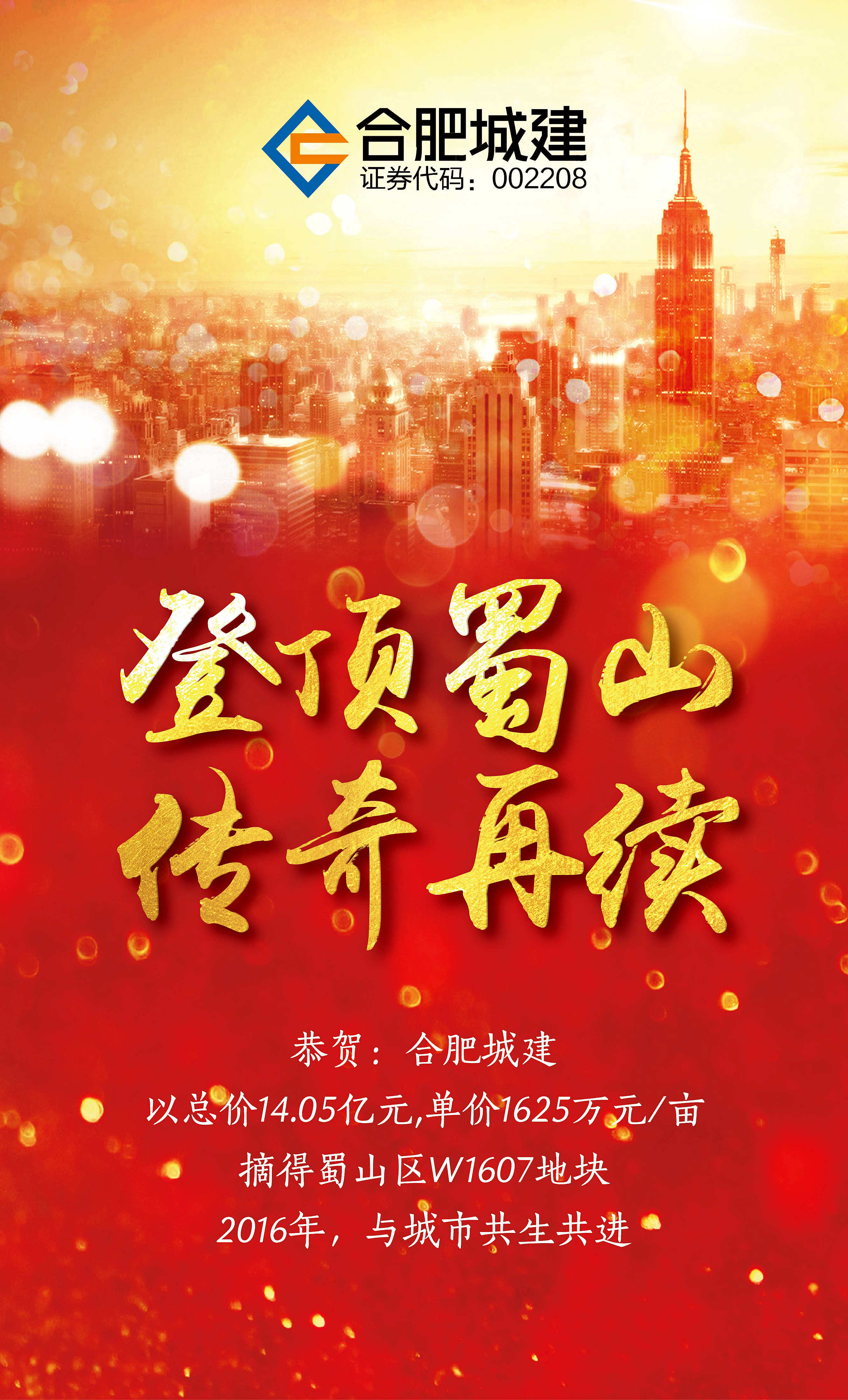 捷报:m88官网登顶蜀山 传奇再续 2016年11月30日下午,合肥市区地块首次全面“限价”土拍,超90家房企群雄逐鹿,m88官网再度发力,最终以成交单价1625万元/亩,总价14.05亿元,成功竞得蜀山区W1607地块。是m88官网布局未来版图的又一重大举措。 该地块占地面积86.44亩,东边紧邻西二环,北边紧邻樊洼路,西...